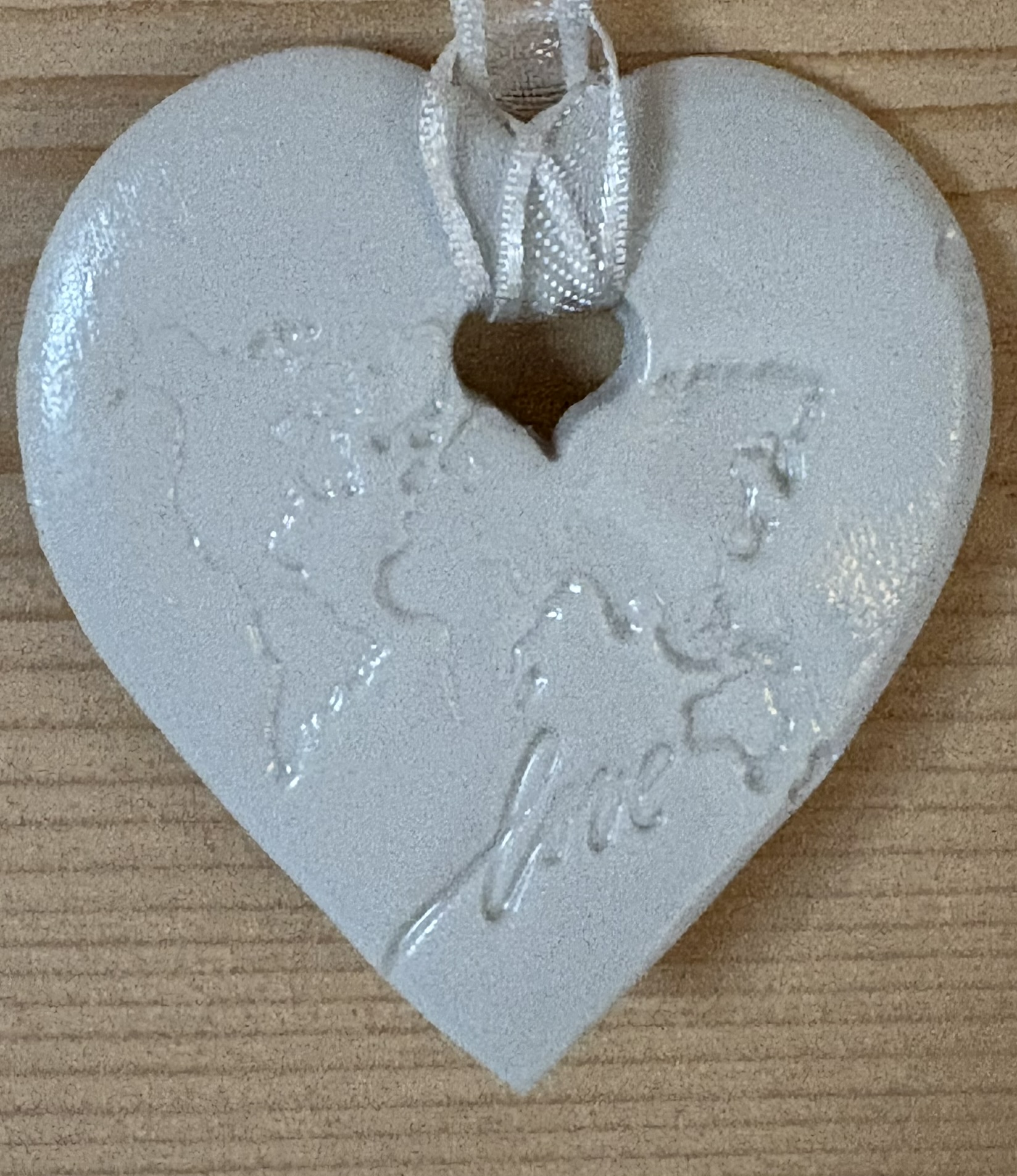 Cœur en porcelaine blanche émaillée avec un message d’amour avec le monde à suspendre ou à poser