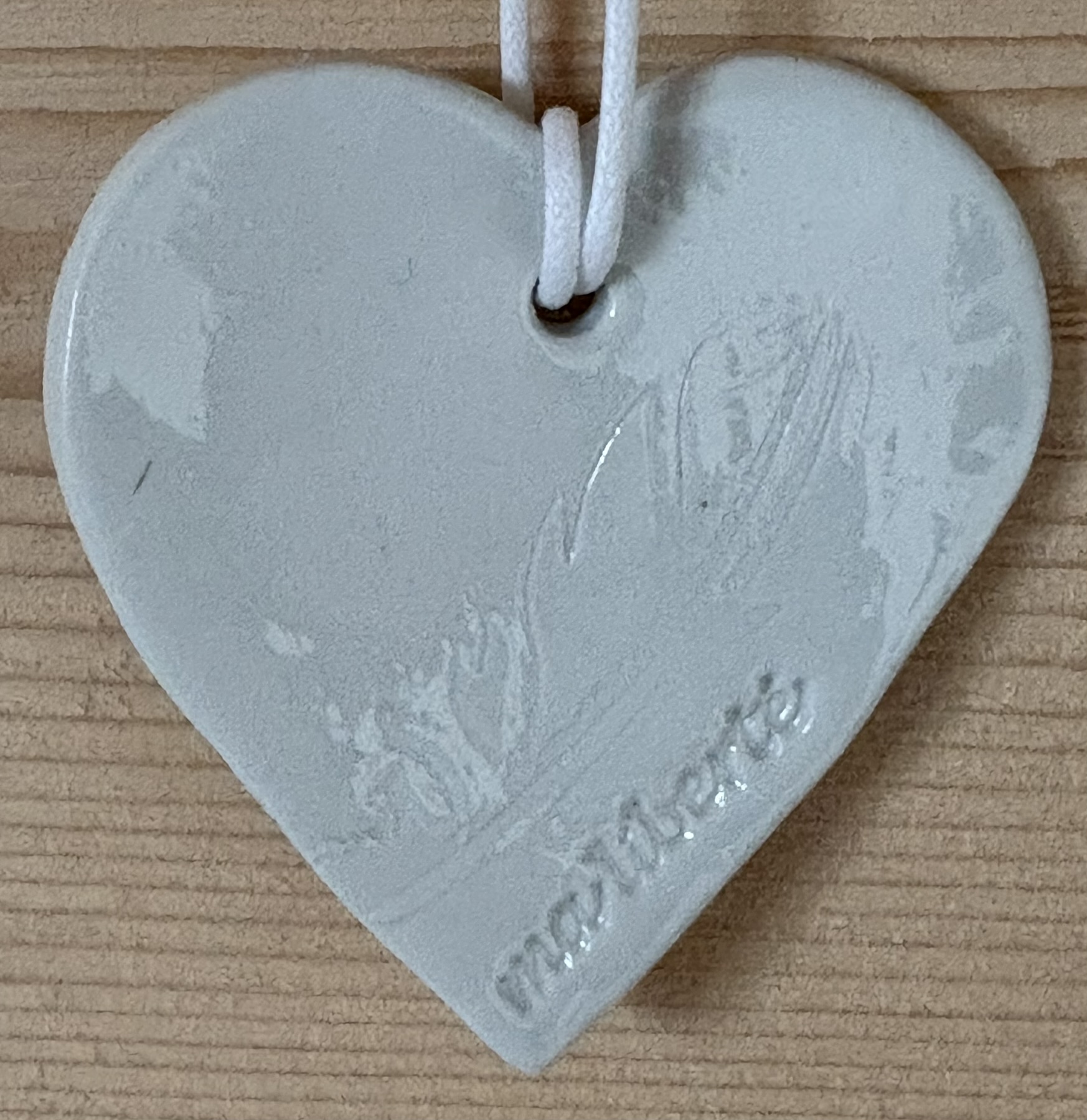 Cœur en porcelaine blanche émaillée avec un message de liberté avec cette plume à suspendre ou à poser