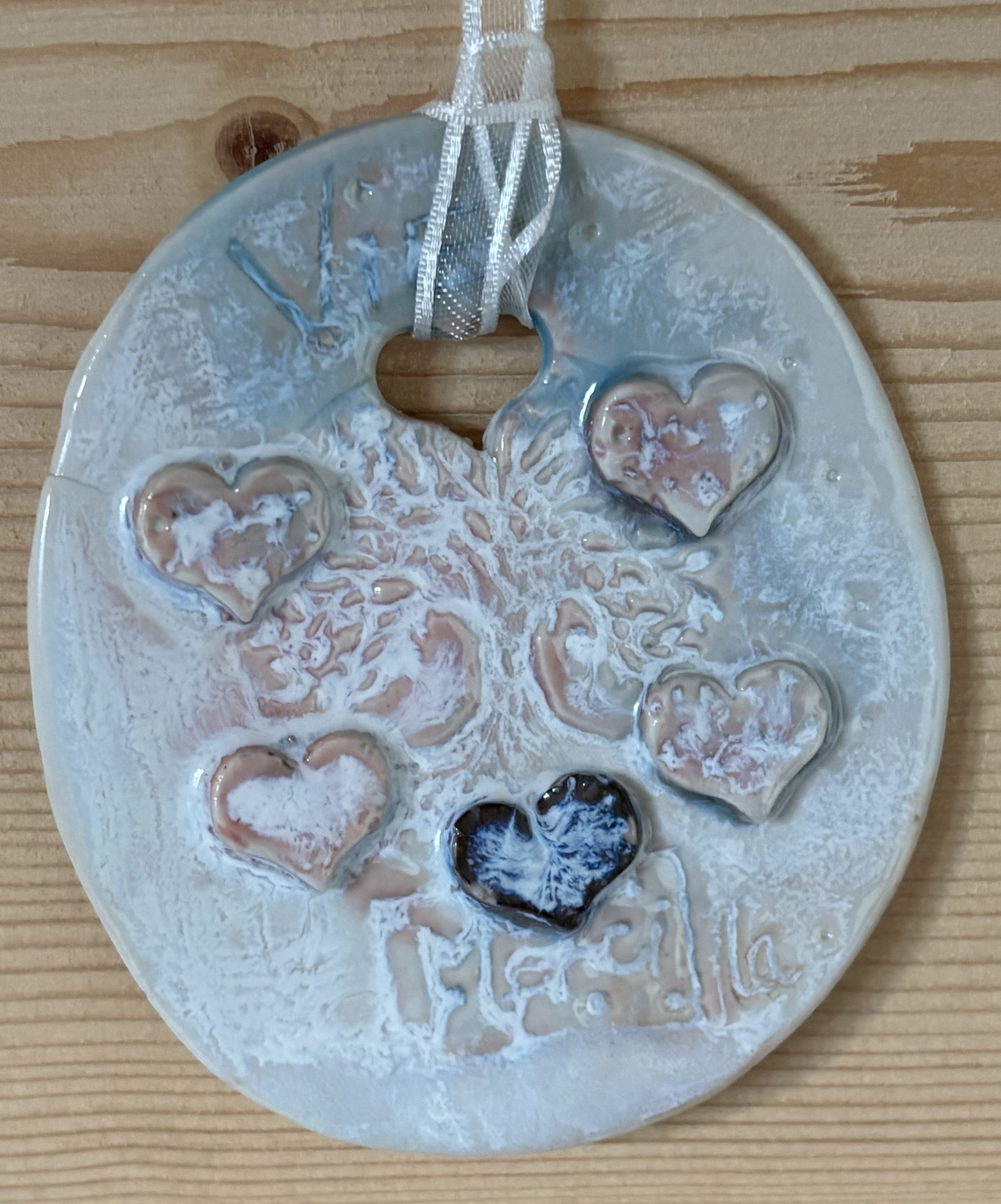 Cœur en porcelaine blanche émaillée : invitation à remercier la Vie et notre Terre mère avec les 5 minis cœurs et cette douceur rosée à suspendre ou à poser