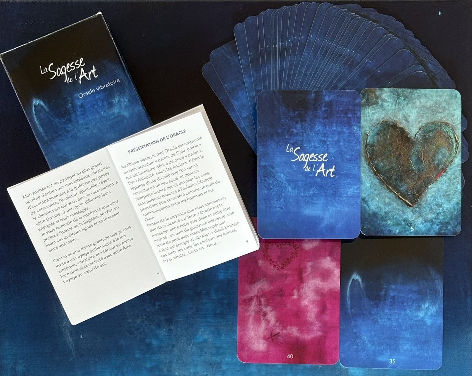 Chaque carte est issue de mes tableaux vibratoires et elle est accompagnée d’un poème, dont les vibrations des mots sauront vous toucher et vous guider.
