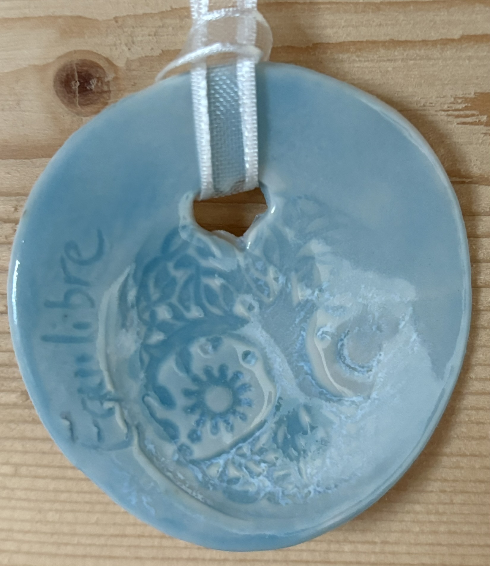 A offrir ou à s’offrirRond en porcelaine blanche émaillée : invitation à l’équilibre jour nuit sous fond de cette magnifique douceur couleur bleu Larimar à suspendre ou à poser